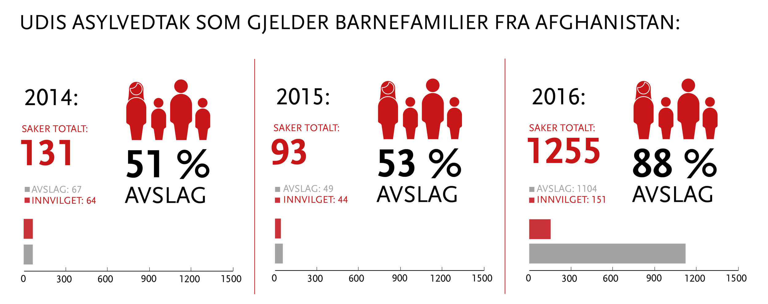 Innstrammingen har særlig rammet de mest sårbare afghanere. 88 prosent av afghanske barnefamilier fikk avslag i 2016, mot om lag 50 prosent i årene før. I 2016 var det hele 627 barn som kom sammen med familien som fikk avslag og som må returnere til Afghanistan. Tilsvarende tall for 2014 og 2015 var 25 og 37. Mange av familiene sendes tilbake til andre områder enn hjemstedet, hvor de gjerne mangler nettverk, som er av svært stor betydning i det afghanske samfunnet, blant annet for å kunne skaffe jobb og et sted å bo.