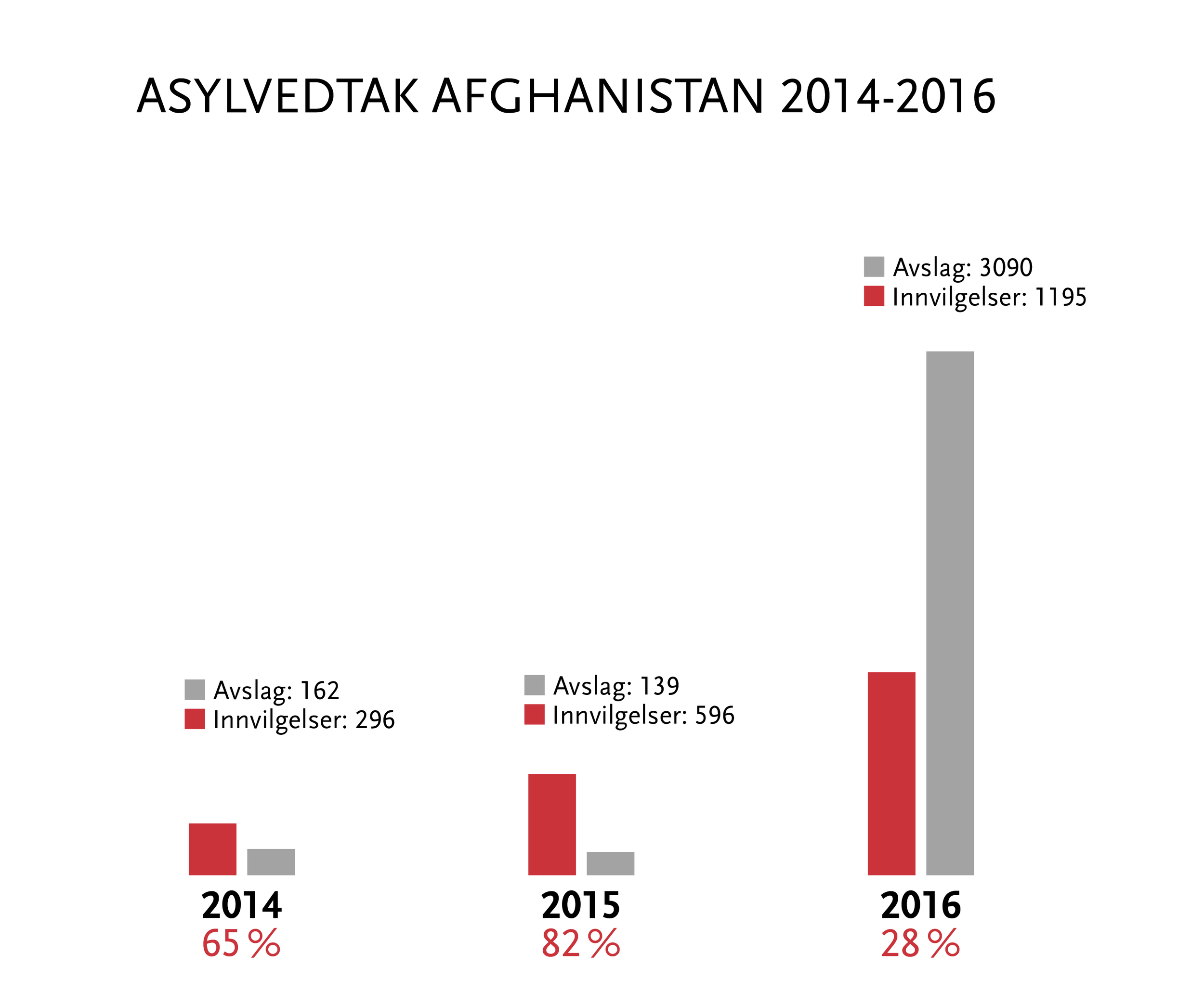 Asylpraksis overfor afghanere ble kraftig strammet inn i løpet av 2016. Av de siste årenes innstramminger, er det nok denne som har rammet flest. Mens 162 og 139 afghanere fikk avslag i 2014 og 139 i 2015, var det i 2016 hele 3090 afghanere som fikk avslag på asylsøknaden. En stor andel var kvinner og barn