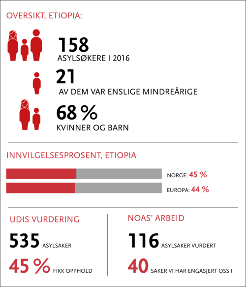 Etiopia-sakene NOAS mottar, gjelder i all hovedsak frykt for reaksjoner på grunn av politisk aktivitet. Omtrent alle asylsøkerne opplyser at de har deltatt i opposisjonell politisk virksomhet i hjemlandet. Noen mener at de risikerer forfølgelse på grunn av familiemedlemmers politiske aktivitet. Mange av de etiopiske asylsøkerne er også politisk aktive i Norge, noe etiopiske myndigheter vet og følger med på.