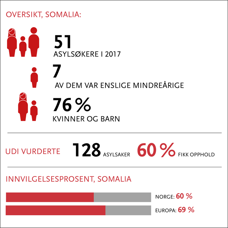 Norske myndigheter vurderer at sikkerhetssituasjonen i Somalia har bedret seg. Det innebærer at det er vanskeligere enn tidligere å få opphold kun på grunn av den generelle sikkerhetssituasjon i seg selv. I 2016 og 2017 utgjorde kvinner og barn den største andelen av somaliske asylsøkere til Norge, noe som kan påvirke innvilgelsesprosenten.