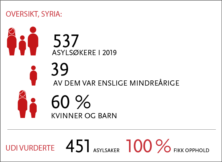 På grunn av borgerkrigen og den generelle voldssituasjonen i Syria, fattet UDI i 2019 ingen vedtak som innebærer at syriske asylsøkere må reise tilbake til hjemlandet. Voldsbruken i landet er i stor grad rettet mot sivile. Syriske myndigheter tillegger ofte innbyggerne en politisk oppfatning og anser dem som opponenter, gjerne hele byer og landsbyer. Syrere får derfor hovedsakelig beskyttelse i Norge etter FNs flyktningkonvensjon, på grunn av tillagt politisk oppfatning.