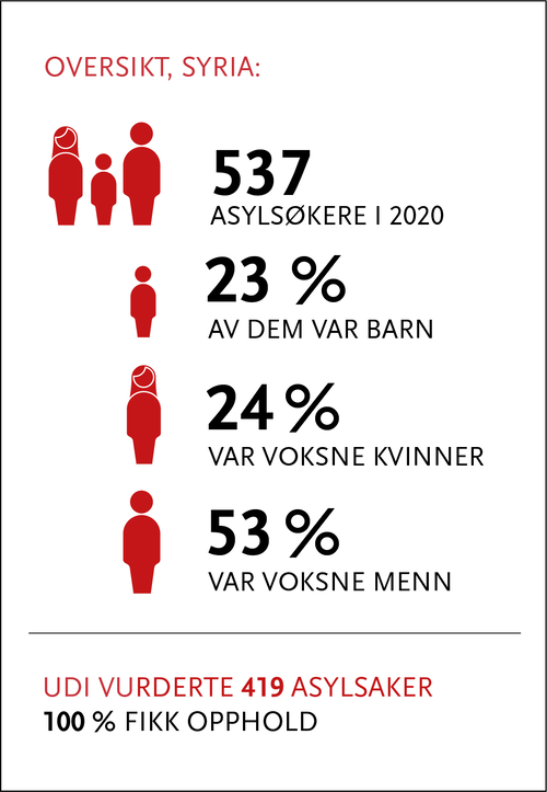 På grunn av borgerkrigen og den generelle voldssituasjonen i Syria, fattet UDI i 2020 ingen vedtak som innebærer at syriske asylsøkere må reise tilbake til hjemlandet. Voldsbruken i landet er i stor grad rettet mot sivile. Syriske myndigheter tillegger ofte innbyggerne en politisk oppfatning og anser dem som opponenter, gjerne hele byer og landsbyer. Syrere får derfor hovedsakelig beskyttelse i Norge etter FNs flyktningkonvensjon, på grunn av tillagt politisk oppfatning.