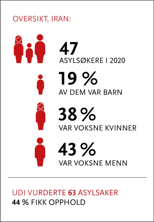 Mange iranske asylsøkere frykter reaksjoner ved retur fordi de har deltatt i ulovlig kurdisk politisk opposisjonsaktivitet i hjemlandet. Noen frykter også reaksjoner på grunn av politisk aktivitet i Norge, blant annet etter politiske ytringer på internett. Norske myndigheter mener det bare er personer med en særdeles aktiv eller synlig politisk profil som vil anses som en trussel og dermed risikerer alvorlige overgrep fra iranske myndigheter ved retur.