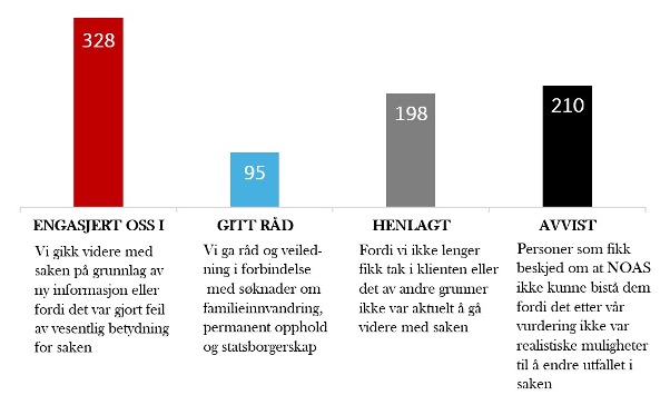 NOAS avviser de langt fleste av sakene vi mottar, fordi vi mener det ikke er realistisk å få endret resultatet. Selv om vi kan være uenige i at det er gitt avslag i en sak, vil det ofte være vanskelig å få vedtaket omgjort. Vi forklarer personer som får saken avvist hos oss, hvorfor vi ikke ser grunnlag for å gå videre med den.